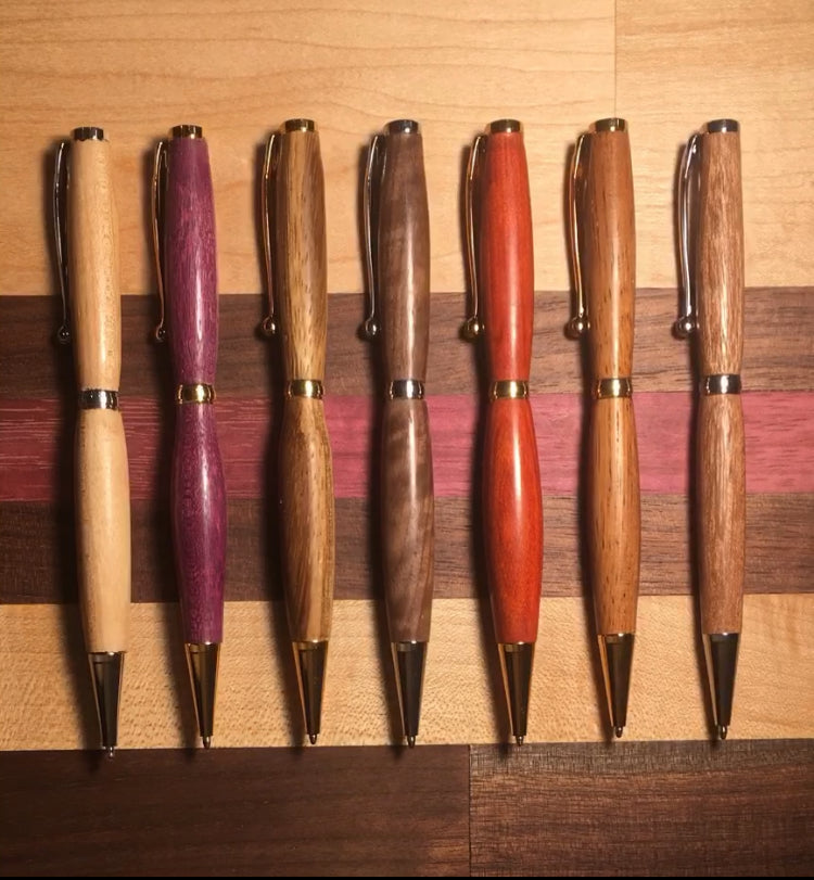 Each pen is created on a base of brass tubing, with a wooden body adhered around it. Each is hand turned then coated with a friction polish for a gloss finish.